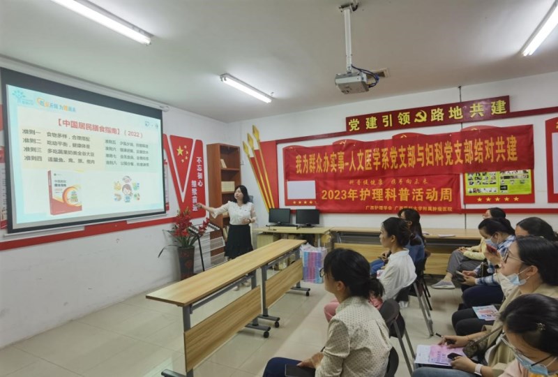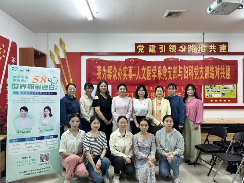 为深入学习贯彻习近平新时代中国特色社会主义思想和党的二十大精神,进一步贯彻落实2023年“全国肿瘤防治宣传周”理念,提高广大群众癌症防控意识,倡导健康生活方式,实现癌症早发现、早诊断、早治疗,不断提高人民群众的健康素养,2023年5月8日,乐动体育 人文医学系党支部与肿瘤医院妇科党支部到南宁市青秀区宁铁馨苑居民小区党群服务中心开展“党建引领同频共振,患教守护群众健康”结对共建系列活动。活动分为科普讲座、健康教育咨询服务等环节。